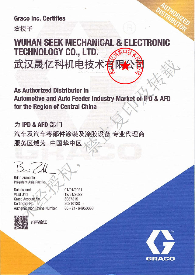 新资质发布(美国GRACO华中地区汽车行业专业一级代理商)